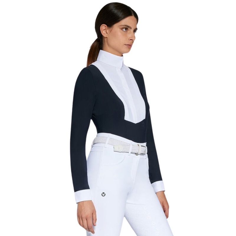 This shirt features a poplin high collar and a front bib with pleated details and hidden buttons. This competition shirt is made from Cavalleria’s signature highly breathable 4-way stretch technical jersey that perfectly fits to the body, following your movements. It features a very small tone on tone logo on the front.