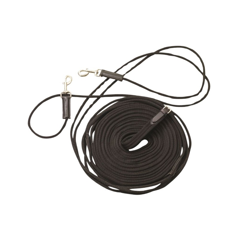 Centaur Long Lines are made from durable nylon and cotton webbing. These good quality, extra-long lines measure 45ft on each side with the first 10ft from the snap being rolled, allowing you to directly snap to the bit or run through the bit and snap to the surcingle ring to create draw reins.