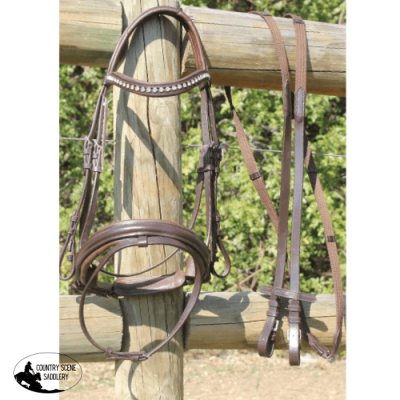 This bridle features quality leather, a padded crank noseband, padded shaped head piece and elegant circle diamonte detailed browband. Suitable for home or competition. Includes nylon web reins, available in black & Brown, Pony, cob & full.