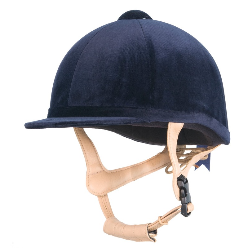 The Grand Prix Riding Hat is low profile, modern and lightweight with a ventilated Glass Fibre reinforced shell, covered in fine rich and durable German velvet. The harness is made from the softest padded leather with a rear drawstring and incorporating a quick release buckle for ease of use.