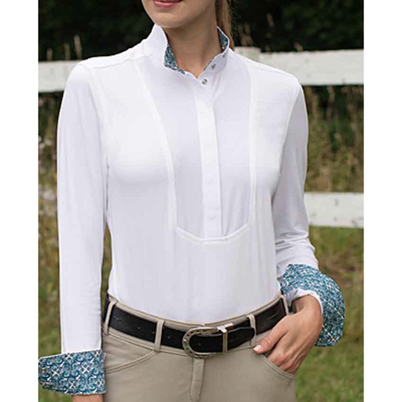 Our ultra-feminine show shirt combines sophisticated design with technical fabrics. Soft mesh lining offers breathable cooling and 4-way stretch under your show jacket. This pull-over shirt features traditional white stretch poplin with quick snaps for a classic polo or more polished show collar appearance. A defined tailored fit, smart color blocking, and beautiful Liberty Fabric prints compliment this show shirt.