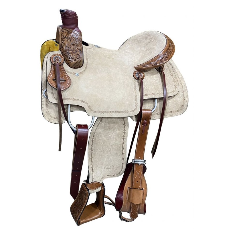 16″, 17″ Circle S Roper Western Saddle with barbed wire tooling on skirt.This Roper Style Western Saddle has barbed wire tooling on skirts and floral tooling on stirrups and pommel. Saddle also features a rough out hard seat, leather wrapped stirrups and a back rigging. Saddle is double rigged and comes with a leather tie strap and off billet.