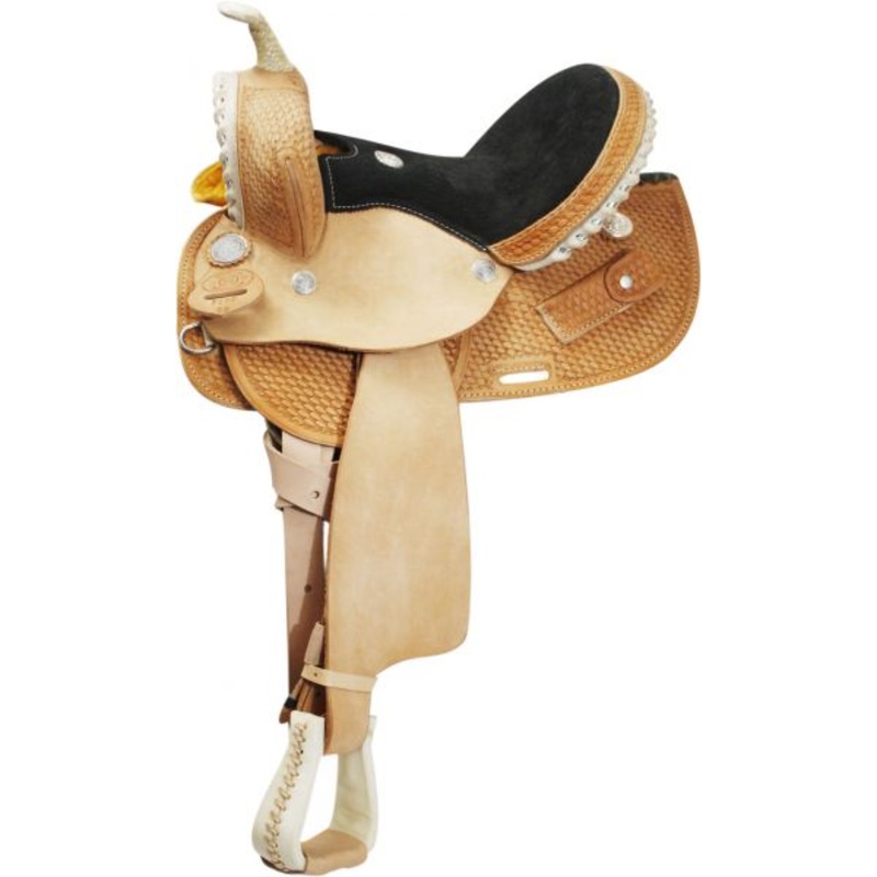 13″, 14″, 15″Round Skirted Barrel Style Saddle made ByCircle S Saddlery. Saddle features basketweave tooling with roughout jockeys and fenders. Silver wrapped rawhide braided cantle, gullet, and horn, along with rawhide stirrups. Suede leather seat, hoof pick keeper, and silver hardware. Comes complete with latigo tie strap and off billet.