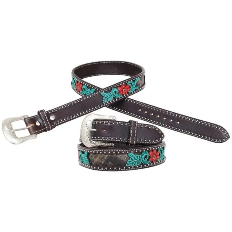 Looking for a belt that finishes off your ensemble? Check out the Circle Y Saddles, Inc. Cactus Flower Belt. Rich walnut with vibrantly hand-painted delicate cactus bloom flower overlays on distressed exotic leather bordered with silver spots to finish the look off. Look in the mirror and exude the confidence that you deserve. Measures 1 1/2″ wide with a silver etched removable buckle. Available in sizes from 26″-44″.