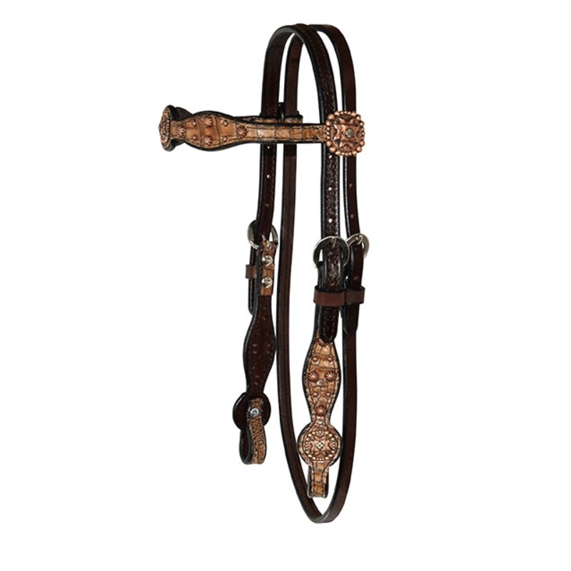 The Circle Y Faux Gator And Copper Gag Cheek Browband Headstall featues a faux gator print, along with copper spots and conchos and a gag cheek.