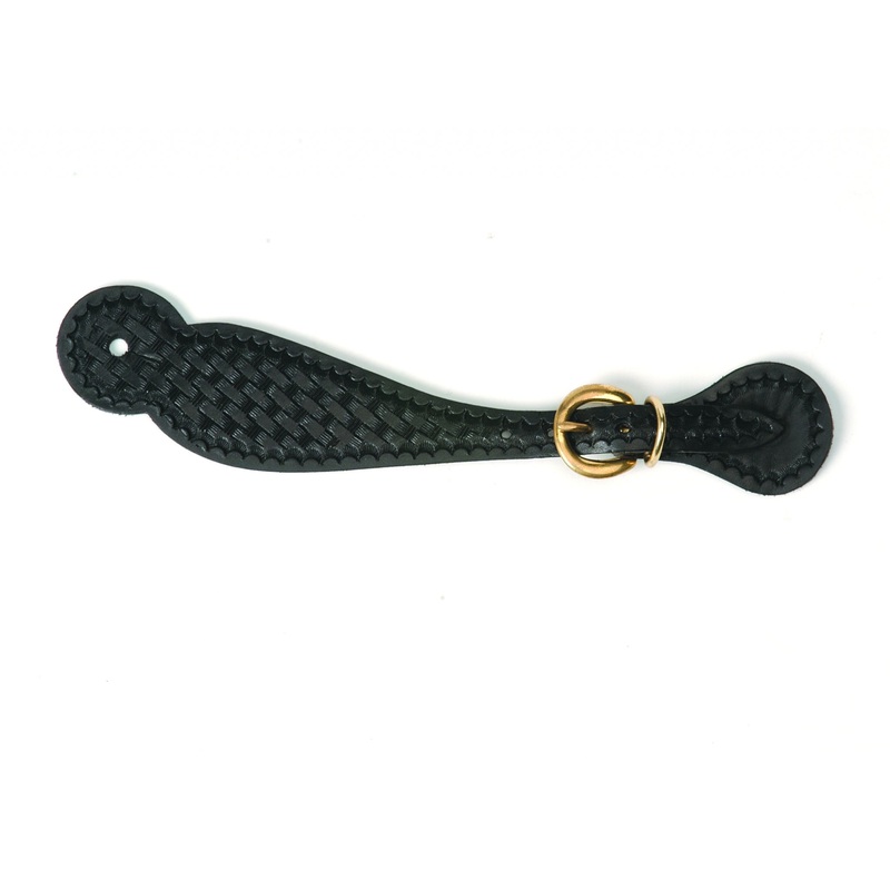 The Colorado Saddlery Basket Stamped Black Spur Straps With Brass Hardware are hand stamped, shaped black spur straps that have brass hardware. Excellent quality at an excellent price! Made in USA.