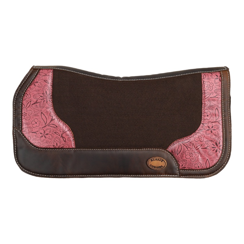 This saddle pad features a sturdy brown felt body for dependable support and comfort, while vibrant pink floral embossed patches on the front and rear bring a burst of feminine flair to your tack setup.