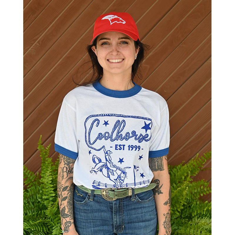 This Coolhorse T-shirt is great for celebrating any patriotic holiday or for everyday wear. Featuring a bold blue bronc rider graphic and “Coolhorse” in a rope script, it also includes stylish blue accents on the collar and sleeves for an extra pop of color.