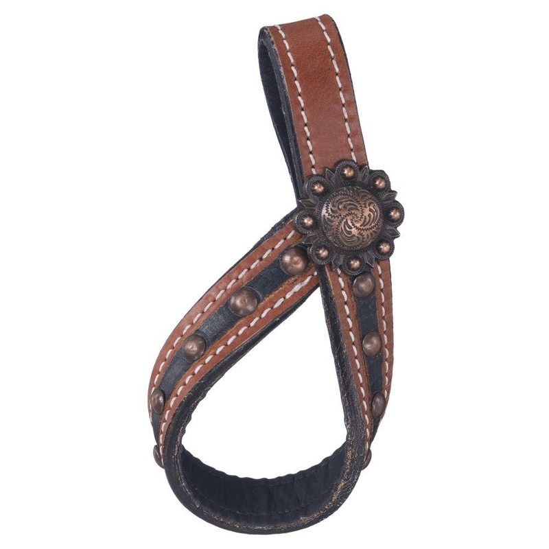 Cooper Belt Buckle Bling Collection tie down hobble features rich tooled leather accented with black line and copper dots. Large rectangle copper buckle tip and keeper with dot accents highlight this set.