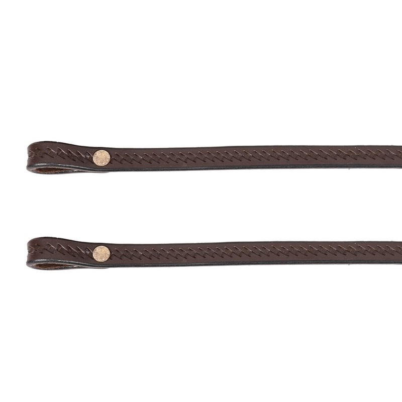 Classically designed split reins feature timeless basket weave tooling for added flair suitable in every discipline. Complete with sturdy hardware and Chicago screw closures for the bit.