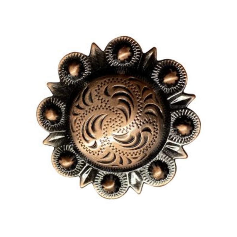 Copper engraved conchowithScrew. This copper engraved replacement concho measures 1-1/2″ x 1-1/2″.