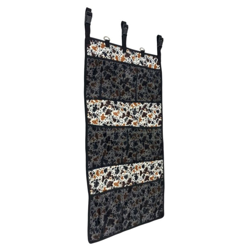 Made from a heavy-duty nylon and nylon mesh, this organizer is built to last and withstands the wear and tear of daily use. The fun cow print also adds a pop of color and flair to your trailer! The 3 adjustable nylon straps and buckles make it easy to secure the organizer in place, while the 2 rings provide a convenient hanging option. It is super versatile and can be hung from virtually anywhere – the barn, stall, trailer, or on the fence!