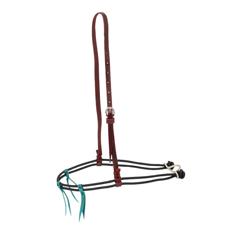 Burgundy latigo leather crownTwo black, double-diamond braided nylon rope nosebandsThree turquoise latigo leather braided tiesStainless steel buckle