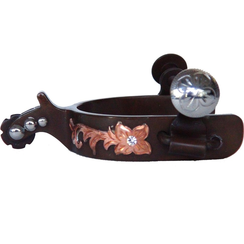 Western Antique Copper Crystal Spurs Antique finish with copper floral trim accented with a clear crystal. 1" band, 3/4" shank. 5/8" rosebud rowel.