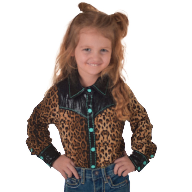 Cowgirl Tuff Girls Pullover Button Up (Leopard With Turquoise Accents Lightweight Stretch Jersey)