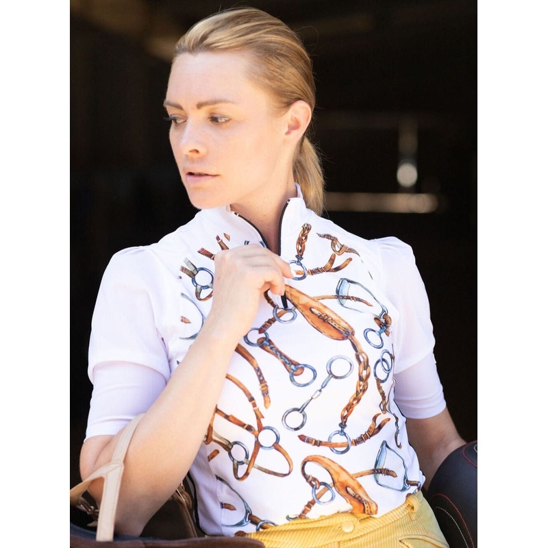 Introducing the Alex Sun Shirt, your new go-to for schooling day style with a touch of equestrian flair. This equestrian-printed shirt seamlessly combines performance features with a modern aesthetic, making it a must-have in your riding wardrobe.