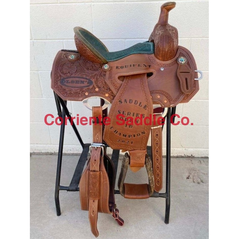 This saddle is built on a wooden rawhide covered tree and comes with a latigo, back flank, stirrups, back billits and offstrap. To order give us a call or email us and we will get started on one for you. We take Visa, Mastercard and Discover. We offer seat sizes 14″ inch, 14.5″ inch, 15″ inch, 15.5″ inch, 16″ inch, 16.5 inch, 17″ inch, and 18″ inch in this saddle. On any saddle, we can add your brand, custom lettering, upgraded conchos, upgraded stirrups, etc. Trophy lettering is available for $50 as well on any saddle.