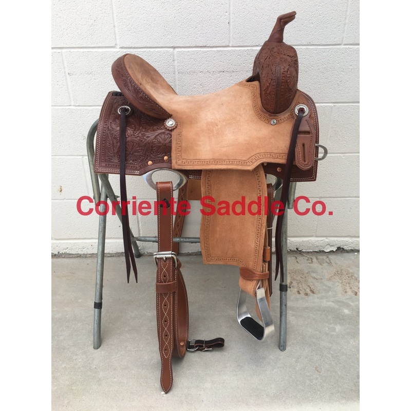 In-Skirt Fancy Dee Ring Front & Back90 Degree SkirtingLeather HornLeather Cheyenne Roll4 Strings Hard SeatPlain Barrel StirrupsSeat Can Be Changed To A Solid Color Suede Seat Of Your ChoiceFURTHER DETAILSThis saddle is built on a wooden rawhide covered tree and comes with a latigo, back flank, stirrups, back billets and offstrap. To order give us a call or email us and we will get started on one for you. We take Visa, Mastercard and Discover. We offer seat sizes 12″ inch, 12.5″ inch, 13″ inch, 13.5″ inch, 14″ inch, 14.5 inch, 15″ inch, 15.5″ inch, 16″ inch, 16.5″ inch and 17″ inch in this saddle. You can also choose between a 4″ inch or 5″ inch tall cantle. On any saddle, we can add your brand, custom lettering, upgraded conchos, upgraded stirrups, etc. Trophy lettering is available for $50 as well on any saddle.Seat can be changed to a solid color suede seat of your choice.