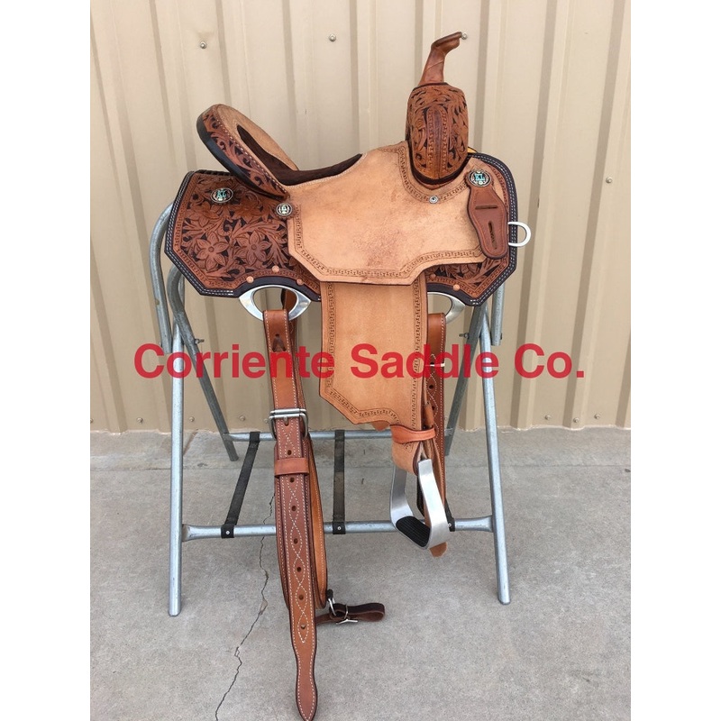 Painted Edges on Tooled PartsIn-Skirt Fancy Dee Ring Front & Back45 Degree SkirtingLeather HornLeather Cheyenne RollNo Strings Inlaid Chocolate SeatPlain Barrel StirrupsCustom Conchos+$100Seat Can Be Changed To A Solid Color Suede Seat Of Your ChoiceFURTHER DETAILSThis saddle is built on a wooden rawhide covered tree and comes with a latigo, back flank, stirrups, back billets and offstrap. To order give us a call or email us and we will get started on one for you. We take Visa, Mastercard and Discover. We offer seat sizes 12″ inch, 12.5″ inch, 13″ inch, 13.5″ inch, 14″ inch, 14.5 inch, 15″ inch, 15.5″ inch, 16″ inch, 16.5″ inch and 17″ inch in this saddle. You can also choose between a 4″ inch or 5″ inch tall cantle. On any saddle, we can add your brand, custom lettering, upgraded conchos, upgraded stirrups, etc. Trophy lettering is available for $50 as well on any saddle.Seat can be changed to a solid color suede seat of your choice.