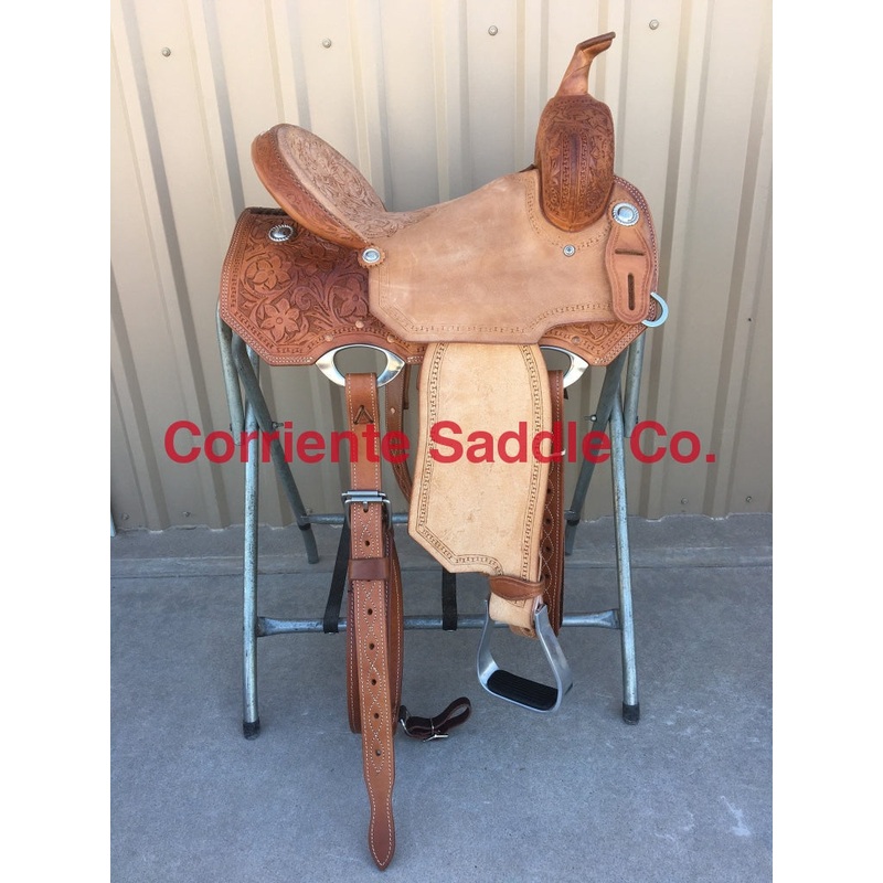 In-Skirt Fancy Dee Ring Front & Back45 Degree SkirtingLeather HornLeather Cheyenne Roll Tooled Hard SeatPlain Barrel StirrupsSeat Can Be Changed To A Solid Color Suede Seat Of Your ChoiceFURTHER DETAILSThis saddle is built on a wooden rawhide covered tree and comes with a latigo, back flank, stirrups, back billets and offstrap. To order give us a call or email us and we will get started on one for you. We take Visa, Mastercard and Discover. We offer seat sizes 12″ inch, 12.5″ inch, 13″ inch, 13.5″ inch, 14″ inch, 14.5 inch, 15″ inch, 15.5″ inch, 16″ inch, 16.5″ inch and 17″ inch in this saddle. You can also choose between a 4″ inch or 5″ inch tall cantle. On any saddle, we can add your brand, custom lettering, upgraded conchos, upgraded stirrups, etc. Trophy lettering is available for $50 as well on any saddle.Seat can be changed to a solid color suede seat of your choice.
