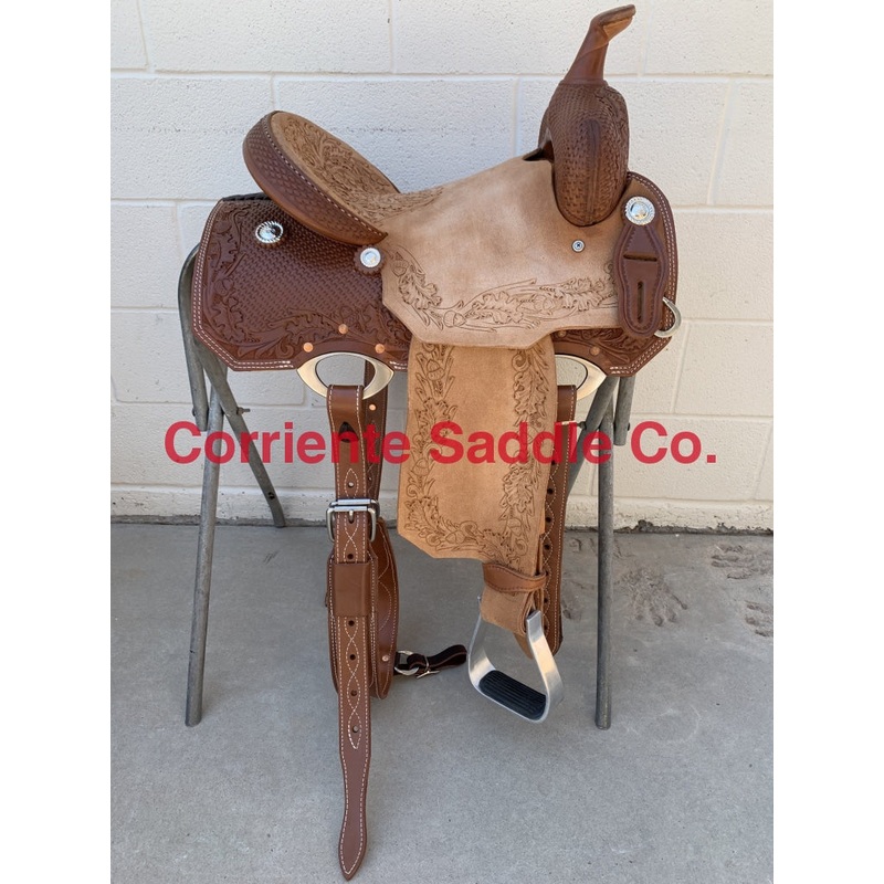No TrimAcorn Border Tooling All Around SaddleIn-Skirt Fancy Dee Ring Front & Back45 Degree SkirtingLeather HornLeather Cheyenne RollTooled Hard SeatPlain Barrel StirrupsSeat Can Be Changed To A Solid Color Suede Seat Of Your ChoiceFURTHER DETAILSThis saddle is built on a wooden rawhide covered tree and comes with a latigo, back flank, stirrups, back billets and offstrap. To order give us a call or email us and we will get started on one for you. We take Visa, Mastercard and Discover. We offer seat sizes 12″ inch, 12.5″ inch, 13″ inch, 13.5″ inch, 14″ inch, 14.5 inch, 15″ inch, 15.5″ inch, 16″ inch, 16.5″ inch and 17″ inch in this saddle. You can also choose between a 4″ inch or 5″ inch tall cantle. On any saddle, we can add your brand, custom lettering, upgraded conchos, upgraded stirrups, etc. Trophy lettering is available for $50 as well on any saddle.Seat can be changed to a solid color suede seat of your choice.