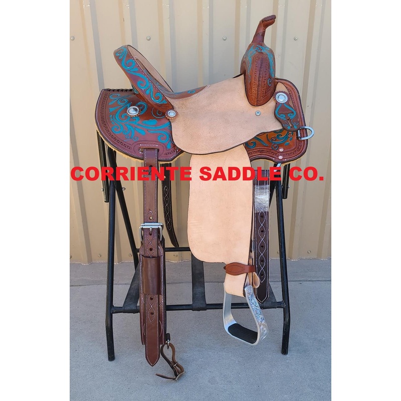SwirlToolingSwirl Painted Turquoise Running W Trim All Around SaddleLeather HornCheyenne RollRound SkirtCutoutsInlaid Tooled SeatEngraved BarrelStirrups+$10SeatCan Be Changed To A Solid Color Suede Seat Of Your ChoiceFURTHER DETAILSThis saddle is built on a wooden rawhide covered tree and comes with a latigo, back flank, stirrups, back billets and offstrap. To order give us a call or email us and we will get started on one for you. We take Visa, Mastercard and Discover. We offer seat sizes 12″ inch, 12.5″ inch, 13″ inch, 13.5″ inch, 14″ inch, 14.5 inch, 15″ inch, 15.5″ inch, 16″ inch, 16.5″ inch and 17″ inch in this saddle. You can also choose between a 4″ inch or 5″ inch tall cantle. On any saddle, we can add your brand, custom lettering, upgraded conchos, upgraded stirrups, etc. Trophy lettering is available for $50 as well on any saddle.Seat can be changed to a solid color suede seat of your choice. Tribal tooling can be painted the color of your choice.