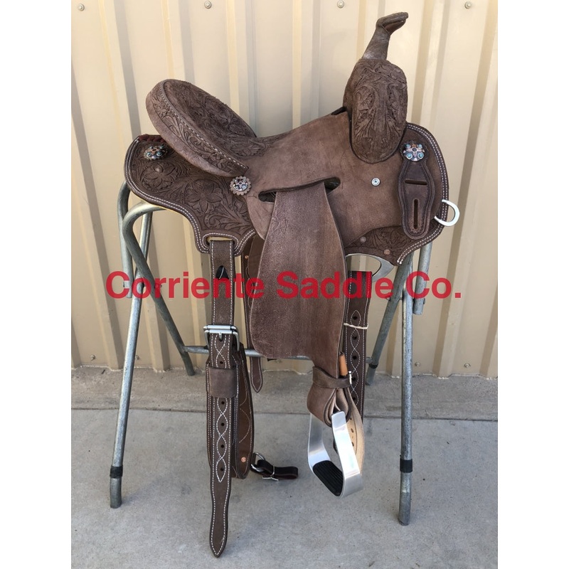 Tooled Hard SeatStrip Down Round SkirtingLeather HornLeather Cheyenne RollTooled Hard SeatPlain Barrel Stirrups**Your Choice Of Custom Conchos Included**SeatCan Be Changed To A Solid Color Suede Seat Of Your ChoiceFURTHER DETAILSThis saddle is built on a wooden rawhide covered tree and comes with a latigo, back flank, stirrups, back billets and offstrap. To order give us a call or email us and we will get started on one for you. We take Visa, Mastercard and Discover. We offer seat sizes 12″ inch, 12.5″ inch, 13″ inch, 13.5″ inch, 14″ inch, 14.5 inch, 15″ inch, 15.5″ inch, and 16″ inch in this saddle. On any saddle, we can add your brand, custom lettering, upgraded conchos, upgraded stirrups, etc. Trophy lettering is available for $50 as well on any saddle.Seat can be changed to a solid color suede seat of your choice.