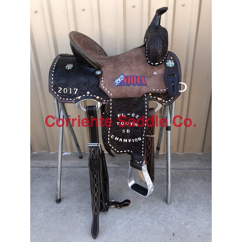 Engraved Barrel StirrupsTrophy Lettering+$50**Your Choice of Custom Conchos Included**SeatCan Be Changed To A Solid Color Suede Seat Of Your ChoiceFURTHER DETAILSThis saddle is built on a wooden rawhide covered tree and comes with a latigo, back flank, stirrups, back billets and offstrap. To order give us a call or email us and we will get started on one for you. We take Visa, Mastercard and Discover. We offer seat sizes 12″ inch, 12.5″ inch, 13″ inch, 13.5″ inch, 14″ inch, 14.5 inch, 15″ inch, 15.5″ inch, and 16″ inch in this saddle. On any saddle, we can add your brand, custom lettering, upgraded conchos, upgraded stirrups, etc. Trophy lettering is available for $50 as well on any saddle.Seat can be changed to a solid color suede seat of your choice.