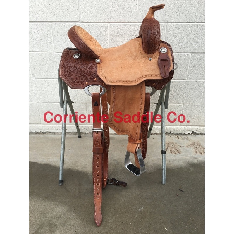 Tooled Hard Seat45 Degree Skirting In-Skirt Fancy Dee Ring Front & BackLeatherHornLeather Cheyenne RollPlain Barrel StirrupsSeatCan Be Changed To A Solid Color Suede Seat Of Your ChoiceFURTHER DETAILSThis saddle is built on a wooden rawhide covered tree and comes with a latigo, back flank, stirrups, back billets and offstrap. To order give us a call or email us and we will get started on one for you. We take Visa, Mastercard and Discover. We offer seat sizes 12″ inch, 12.5″ inch, 13″ inch, 13.5″ inch, 14″ inch, 14.5 inch, 15″ inch, 15.5″ inch, and 16″ inch in this saddle. On any saddle, we can add your brand, custom lettering, upgraded conchos, upgraded stirrups, etc. Trophy lettering is available for $50 as well on any saddle.Seat can be changed to a solid color suede seat of your choice.