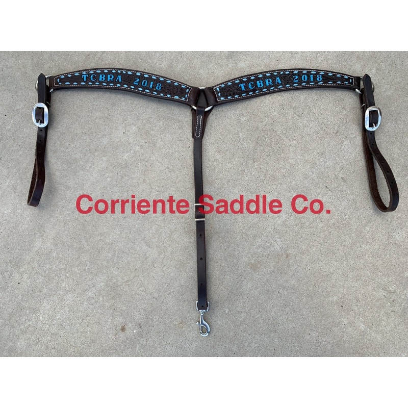 Barrel 3-PieceBreast CollarChocolate LeatherDouble Flower ToolingTurquoiseBuckstitch BorderChoose A Breast Collar to Match Your SaddleLettering Painted TurquoiseLetteringIncluded