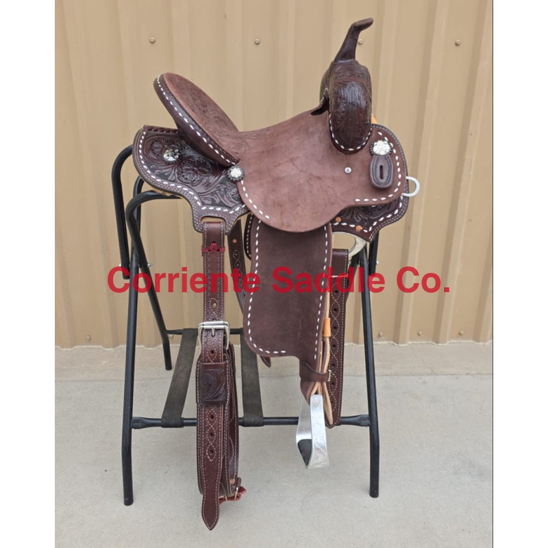 Real Wool Sheepskin LiningAvailable+$150Corriente High Profile (HP3) Barrel Saddle**CHOCOLATE LEATHER****White Buckstitch All**Half BreedRough OutDouble Flower ToolingNo Border TrimStrip Down Round SkirtingLeather HornLeather Cheyenne RollTooled Hard SeatEngraved Barrel Stirrups**Your Choice of Custom Conchos Included**SeatCan Be Changed To A Solid Color Suede Seat Of Your ChoiceFURTHER DETAILSThis saddle is built on a wooden rawhide covered tree and comes with a latigo, back flank, stirrups, back billets and off strap. To order give us a call or email us and we will get started on one for you. We take Visa, Mastercard and Discover. We offer seat sizes 13″ inch, 13.5″ inch, 14″ inch, 14.5 inch, 15″ inch, 15.5″ inch, 16″ inch, 17″ inch in this saddle. On any saddle, we can add your brand, custom lettering, upgraded conchos, upgraded stirrups, etc. Trophy lettering is available for $50 as well on any saddle. Seat can be changed to a solid color suede seat of your choice.