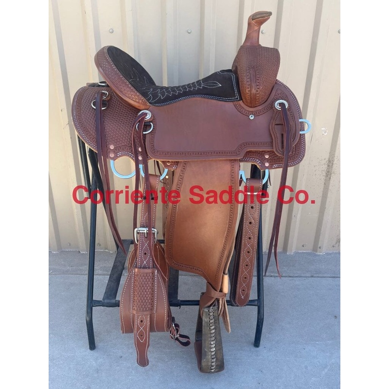 This saddle is built on a wooden rawhide covered tree and comes with a latigo, back flank, stirrups, back billets and offstrap. To order give us a call or email us and we will get started on one for you. We take Visa, Mastercard and Discover. We offer seat sizes 14″ inch, 14.5″ inch, 15″ inch, 15.5″ inch, 16″ inch, 16.5 inch, 17″ inch, and 18″ inch in this saddle. On any saddle, we can add your brand, custom lettering, upgraded conchos, upgraded stirrups, etc. Trophy lettering is available for $50 as well on any saddle. Seat can be changed to a solid color suede seat of your choice.