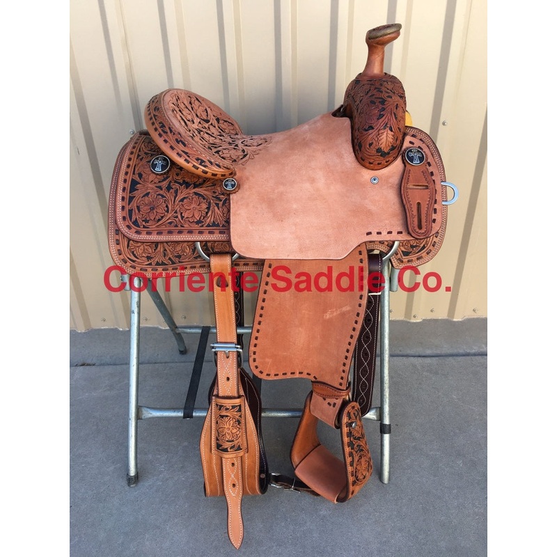 This saddle is built on a wooden rawhide covered tree and comes with a latigo, back flank, stirrups, back billits and offstrap. To order give us a call or email us and we will get started on one for you. We take Visa, Mastercard and Discover. We offer seat sizes 14″ inch, 14.5″ inch, 15″ inch, 15.5″ inch, 16″ inch, 16.5 inch, 17″ inch, and 18″ inch in this saddle. On any saddle, we can add your brand, custom lettering, upgraded conchos, upgraded stirrups, etc. Trophy lettering is available for $50 as well on any saddle.