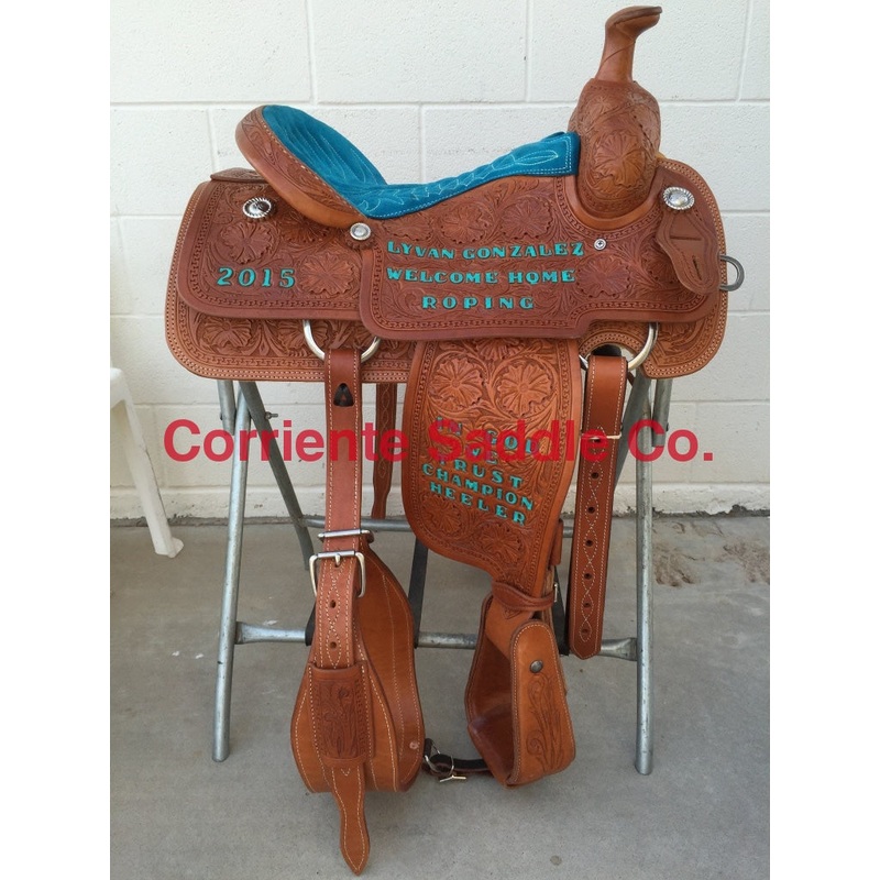 Turquoise Seat with StitchingLeather Tooled StirrupsTrophy Lettering $50Lettering Painted Turquoise Seat can be changed to a solid color suede seat of your choice.