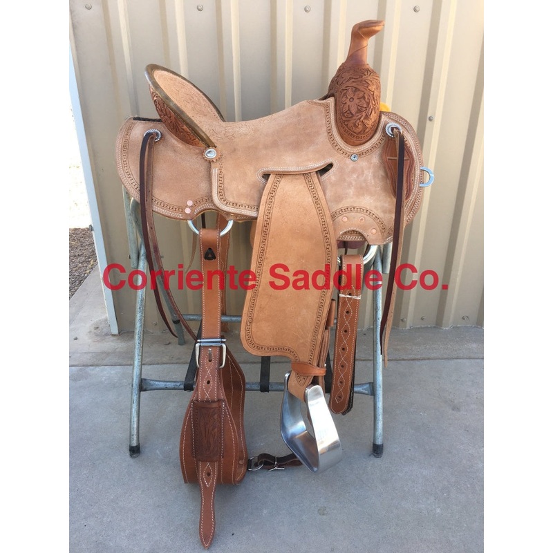 This saddle is built on a wooden rawhide covered tree and comes with a latigo, back flank, stirrups, back billits and offstrap. To order give us a call or email us and we will get started on one for you. We take Visa, Mastercard and Discover. We offer seat sizes 14″ inch, 14.5″ inch, 15″ inch, 15.5″ inch, 16″ inch, 16.5 inch, 17″ inch, and 18″ inch in this saddle. On any saddle, we can add your brand, custom lettering, upgraded conchos, upgraded stirrups, etc. Trophy lettering is available for $50 as well on any saddle.