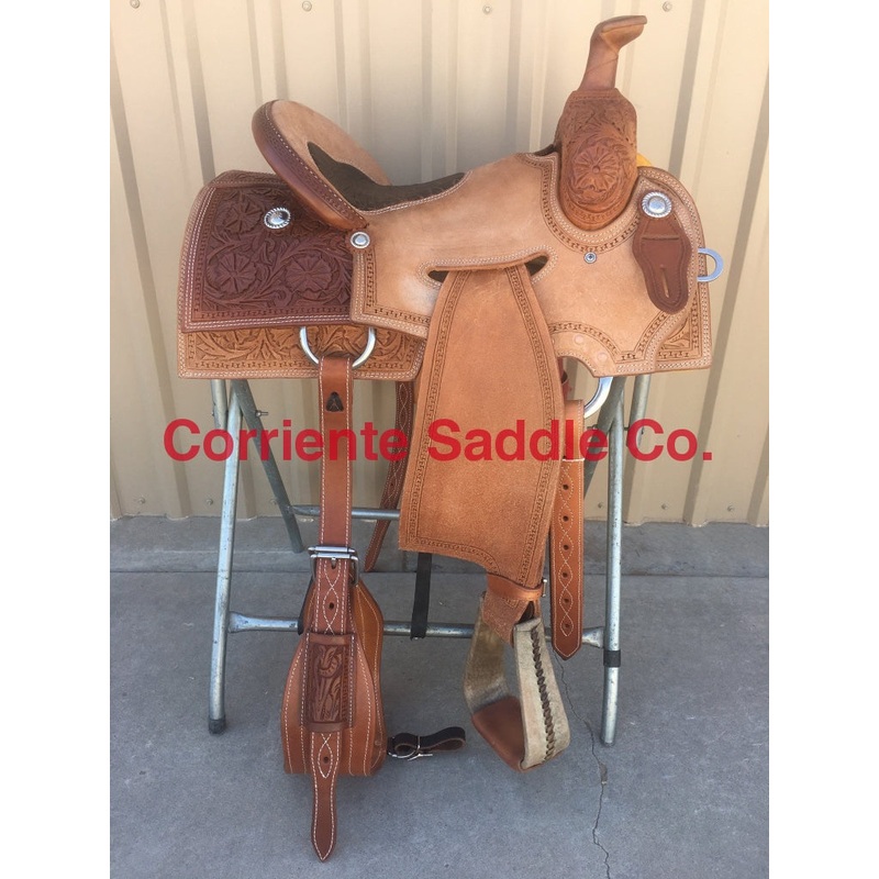 This saddle is built on a wooden rawhide covered tree and comes with a latigo, back flank, stirrups, back billits and offstrap. To order give us a call or email us and we will get started on one for you. We take Visa, Mastercard and Discover. We offer seat sizes 14″ inch, 14.5″ inch, 15″ inch, 15.5″ inch, 16″ inch, 16.5 inch, 17″ inch, and 18″ inch in this saddle. On any saddle, we can add your brand, custom lettering, upgraded conchos, upgraded stirrups, etc. Trophy lettering is available for $50 as well on any saddle.
