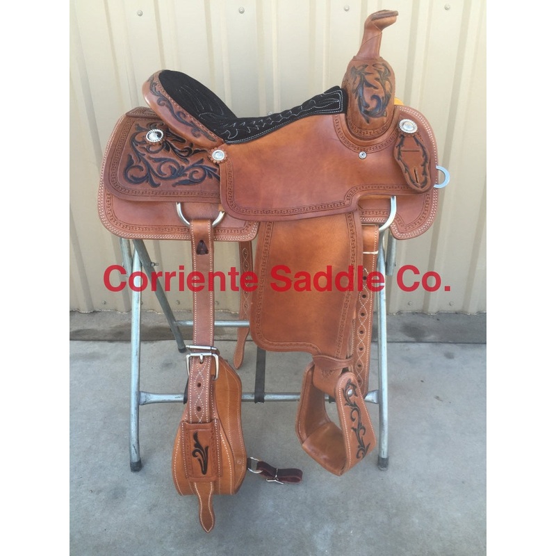 This saddle is built on a wooden rawhide covered tree and comes with a latigo, back flank, stirrups, back billits and offstrap. To order give us a call or email us and we will get started on one for you. We take Visa, Mastercard and Discover. We offer seat sizes 14″ inch, 14.5″ inch, 15″ inch, 15.5″ inch, 16″ inch, 16.5 inch, 17″ inch, and 18″ inch in this saddle. On any saddle, we can add your brand, custom lettering, upgraded conchos, upgraded stirrups, etc. Trophy lettering is available for $50 as well on any saddle. Seat can be changed to a solid color suede seat of your choice. Tribal tooling can be painted the color of your choice.
