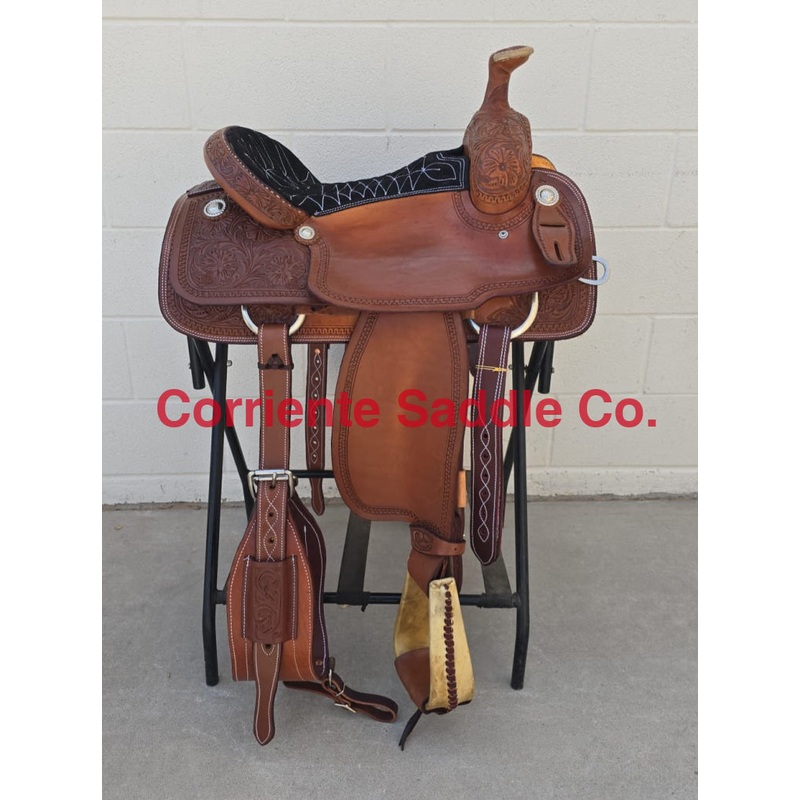 This saddle is built on a wooden rawhide covered tree and comes with a latigo, back flank, stirrups, back billits and offstrap. To order give us a call or email us and we will get started on one for you. We take Visa, Mastercard and Discover. We offer seat sizes 14″ inch, 14.5″ inch, 15″ inch, 15.5″ inch, 16″ inch, 16.5 inch, 17″ inch, and 18″ inch in this saddle. On any saddle, we can add your brand, custom lettering, upgraded conchos, upgraded stirrups, etc. Trophy lettering is available for $50 as well on any saddle. Seat can be changed to a solid color suede seat of your choice.