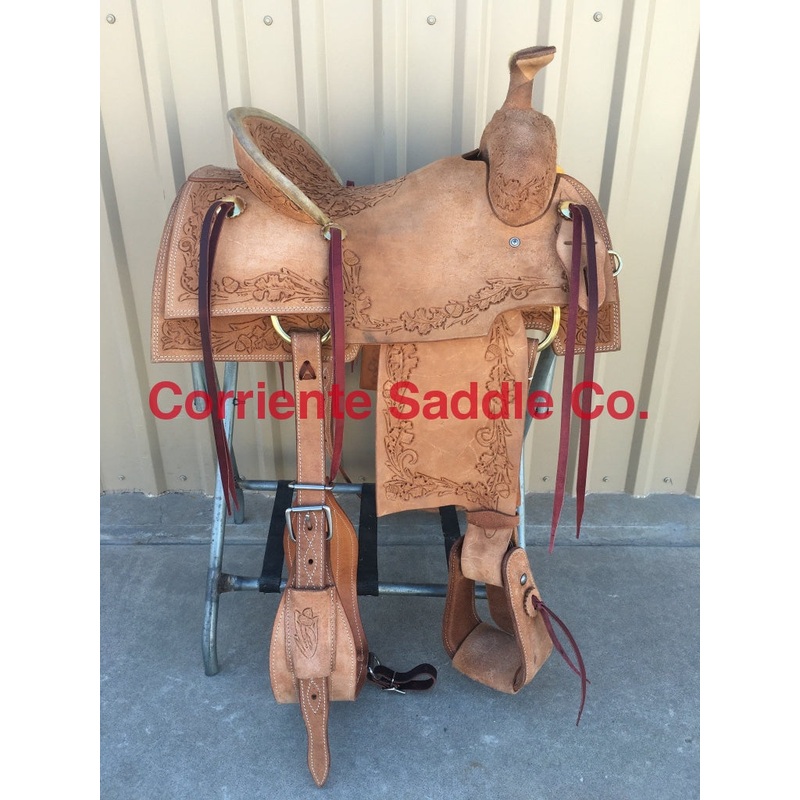 This saddle is built on a wooden rawhide covered tree and comes with a latigo, back flank, stirrups, back billits and offstrap. To order give us a call or email us and we will get started on one for you. We take Visa, Mastercard and Discover. We offer seat sizes 14″ inch, 14.5″ inch, 15″ inch, 15.5″ inch, 16″ inch, 16.5 inch, 17″ inch, and 18″ inch in this saddle. On any saddle, we can add your brand, custom lettering, upgraded conchos, upgraded stirrups, etc. Trophy lettering is available for $50 as well on any saddle. Seat can be changed to a solid color suede seat of your choice.