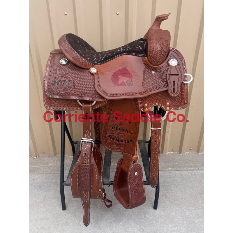 Running W Trim All OverCorner Tooling on FenderCheyenne RollClose Contact CutoutsChocolateSeat with White StitchingLeather TooledStirrupsFURTHER DETAILSThis saddle is built on a wooden rawhide covered tree and comes with a latigo, back flank, stirrups, back billets and offstrap. To order give us a call or email us and we will get started on one for you. We take Visa, Mastercard and Discover. We offer seat sizes 14″ inch, 14.5″ inch, 15″ inch, 15.5″ inch, 16″ inch, 16.5 inch, 17″ inch, and 18″ inch in this saddle. On any saddle, we can add your brand, custom lettering, upgraded conchos, upgraded stirrups, etc. Trophy lettering is available for $50 as well on any saddle.
