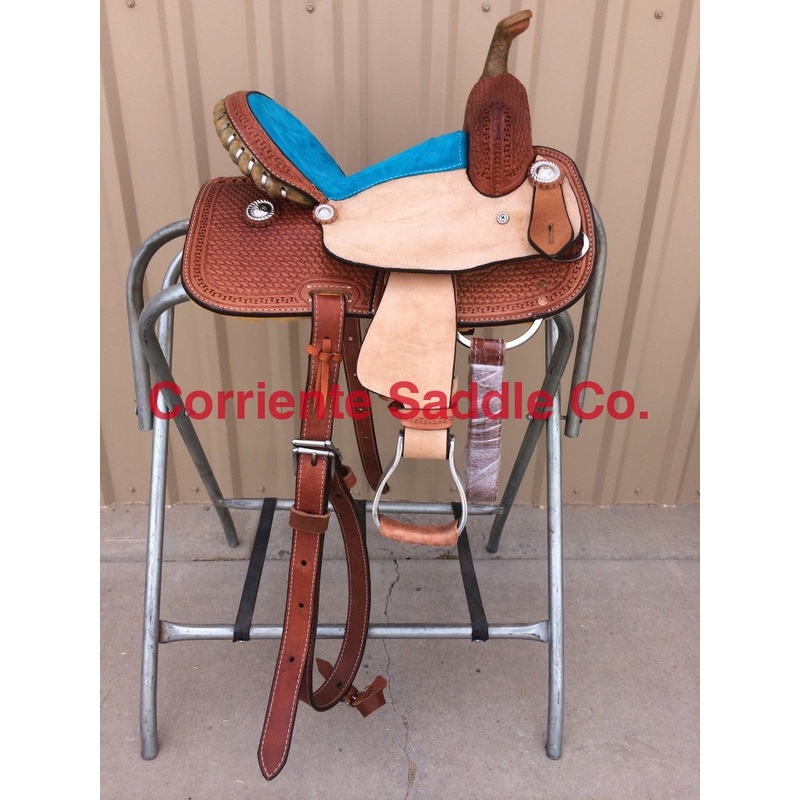 Basket Tooling Running W Trimon Tooled Part OnlyRawhide Braided HornSilver Lace on CantleTurquoiseSeat with Rainbow Stitching **Seat can be changed to a solid color suede seat of your choice**FURTHER DETAILSThis saddle is built on a wooden rawhide covered tree and comes with a latigo, back flank, stirrups, back billits and offstrap. To order give us a call or email us and we will get started on one for you. We take Visa, Mastercard and Discover. On any saddle, we can add your brand, custom lettering, upgraded conchos, upgraded stirrups, etc. Trophy lettering is available for $50 as well on any saddle. Seat can be changed to a solid color suede seat of your choice.
