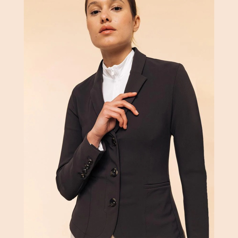 The Tzara competition jacket was developed as a tailor-made piece. It is identified by its blazer collar, its princess cut-outs on the front and back, 2 false pockets with simple piping, its 3 logo buttons on the front and its 4 buttons on each wrist. Tzara is also very breathable thanks to its mesh inserts under the arms.