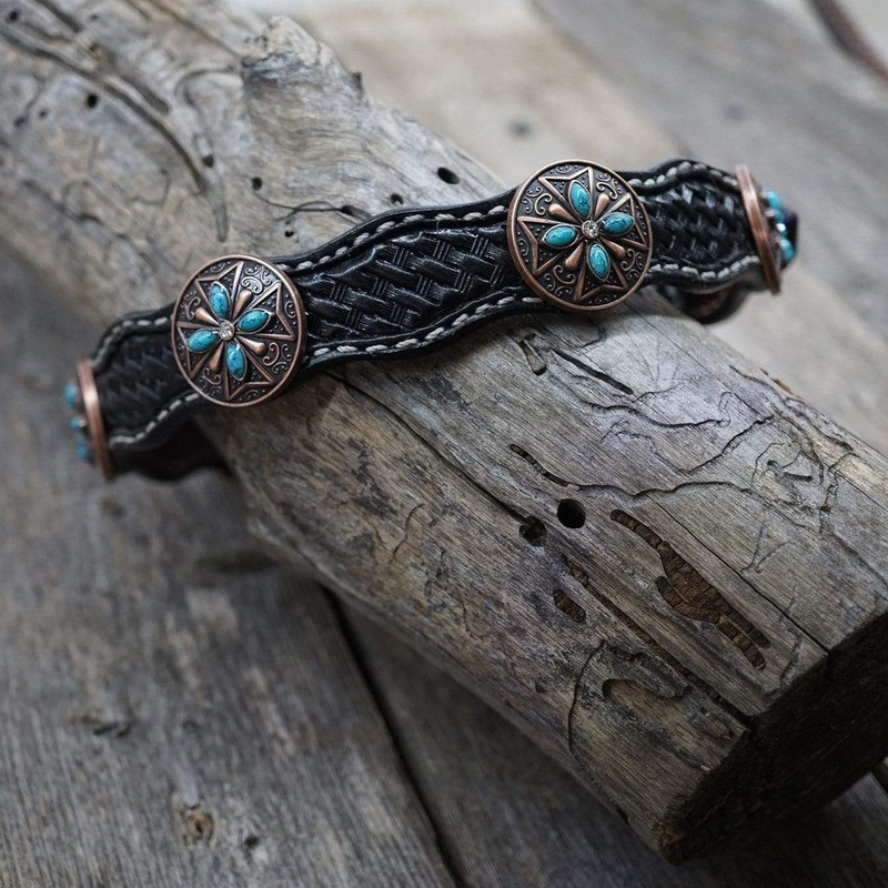 Handmade leather black dog collar with basketweave tooling. Decorated with fourcopper turquoise western conchos.