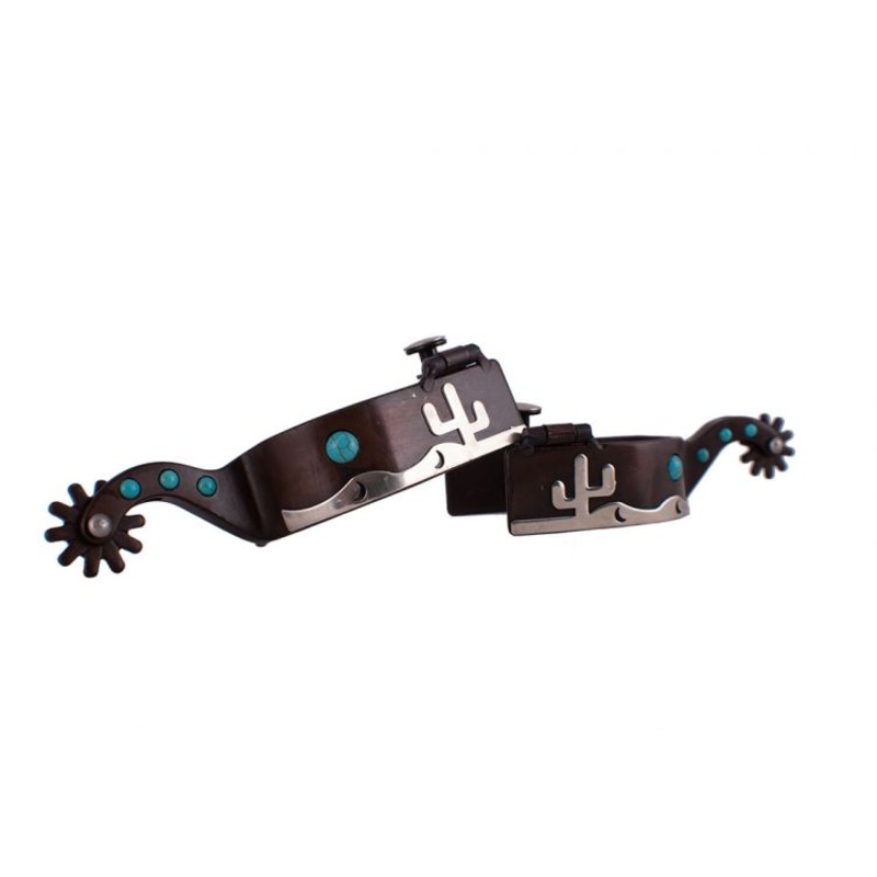 Showman Men’s size brown steel spur with silver desert overlay and teal marble studs. Spur details: 3″ boot opening, 1-1/4″ band, and 2″ shank.