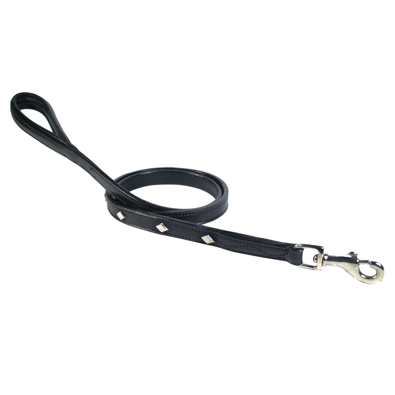 Show off your pet with this attractive designer diamond studded dog leash made by Derby. The leash is made sturdy and long lasting with its quality design and durable stitching. This product is made with a soft leather padded handle for a reinforced comfortable grip for long walks. The other end of the leash is complete with an easy to handle spring hook allowing it to be quick to clasp on or take off. The use of leather on the leash allows for a tangle-free easy walk without the lead getting wrapped around your pets legs. This flat leash comes in 2 different lengths of 4 ft long and 6 ft long in an attractive black color accented with diamond stud design.