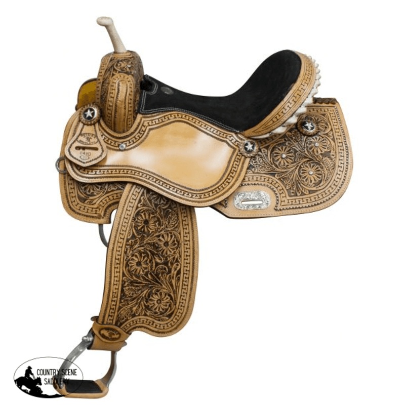 Double T barrel saddle with floral tooling and black inlay. Saddle features inskirt riggin, rawhide silver laced cantle and rawhide braided horn. Saddle is accented with clear rhinestonesand silver star conchos. Made by Double T Saddlery.