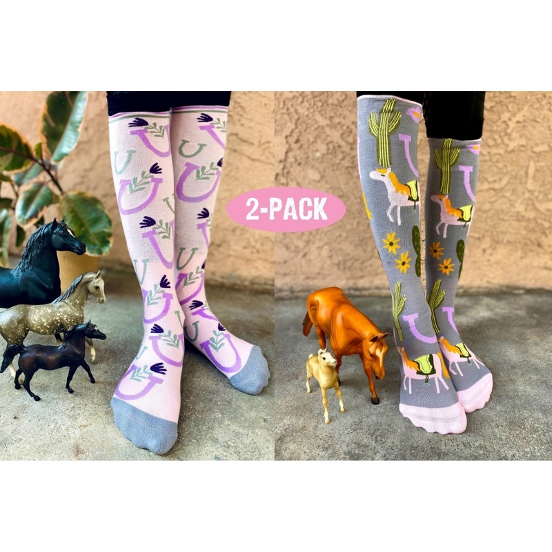 The 2-pack Includes one pair of each design that is knit right into the sock. This sock is stretchy and fits all leg widths. Materials: 75% Cotton, 22% Poly, 3% Elastane. Knit socks do not come with a spare sock.