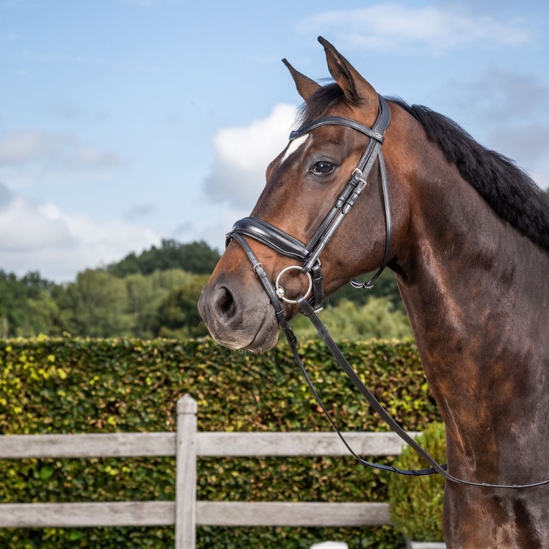 The Dy’on Dressage Matt Large Crank Noseband Bridle with Flash is a premium dressage bridle designed for both performance and comfort. Crafted from high-quality matte leather, it features a slightly raised, supple V-shaped browband and an anatomically shaped 38 mm wide noseband. The noseband is equipped with a pull-back closure mounted on a padded protective backing and includes a 13 mm removable flash strap. The bridle also boasts a thin, soft headpiece with anatomic cutting to relieve pressure at the base of the ears, enhancing the horse’s comfort during use.