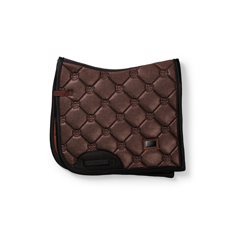 Elegant saddle pad in brown glitter with chrome and black details. Decorated with Equestrian Stockholm badge in chrome. The material is treated with High IQ cool comfort which gives the saddle pad quick dry and moisture wicking abilities. This helps your horse stay dry and fresh longer. We have added a durable protection patch under the velcro strap by the girth where there is most wear and tear. Style with other pieces from our Mahogany Glimmer collection for a head-to-toe stylish look.