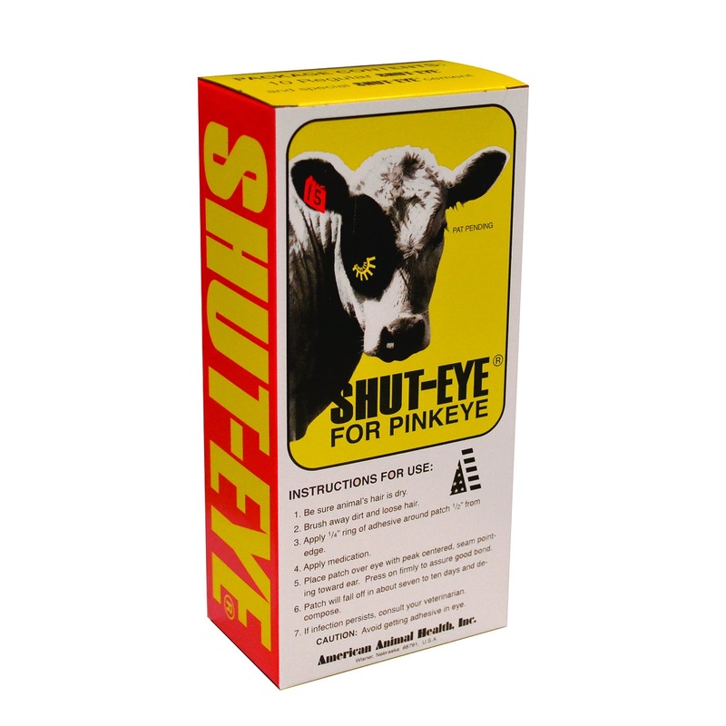Protective eye patch for pinkeye treatment. Patch is glued on over the eye to protect the eye and the medication. Falls of in about 10 days. Biodegradable. Protects eye from insects, tall grass, weeds, wind and sunlight.